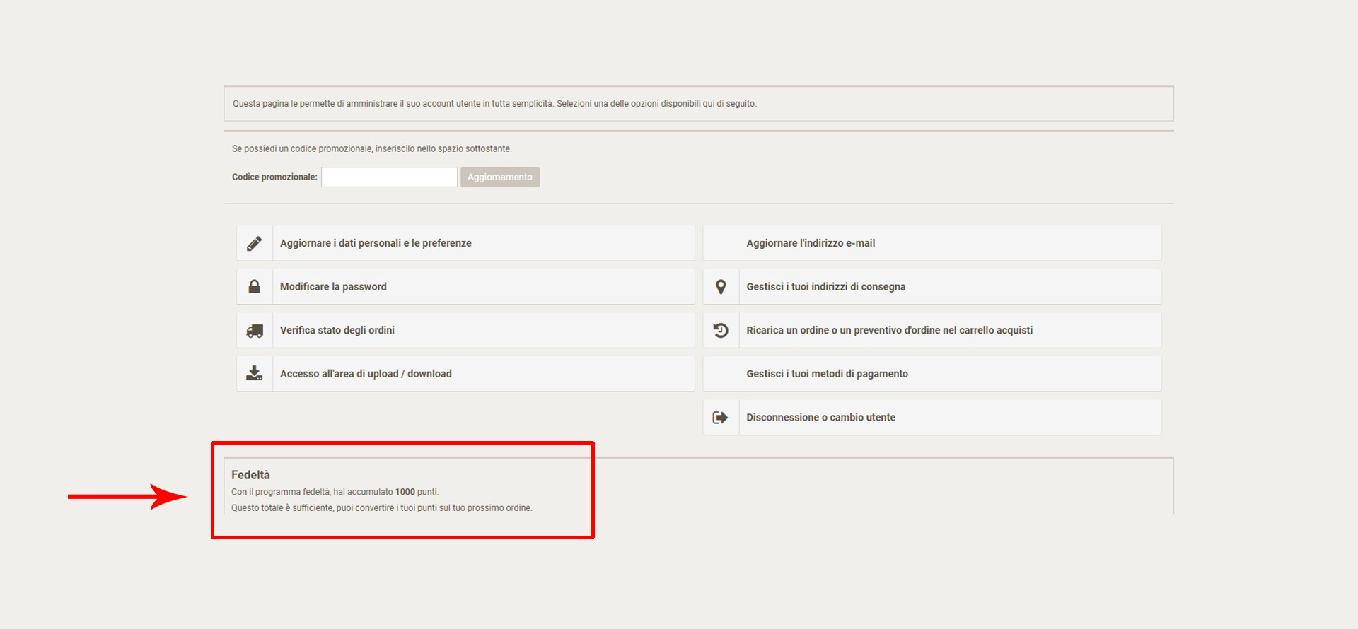 Una volta entrato nella sua area personale, il sistema vedrà quanti punti ha a disposizione per il realizzare il suo ordine: