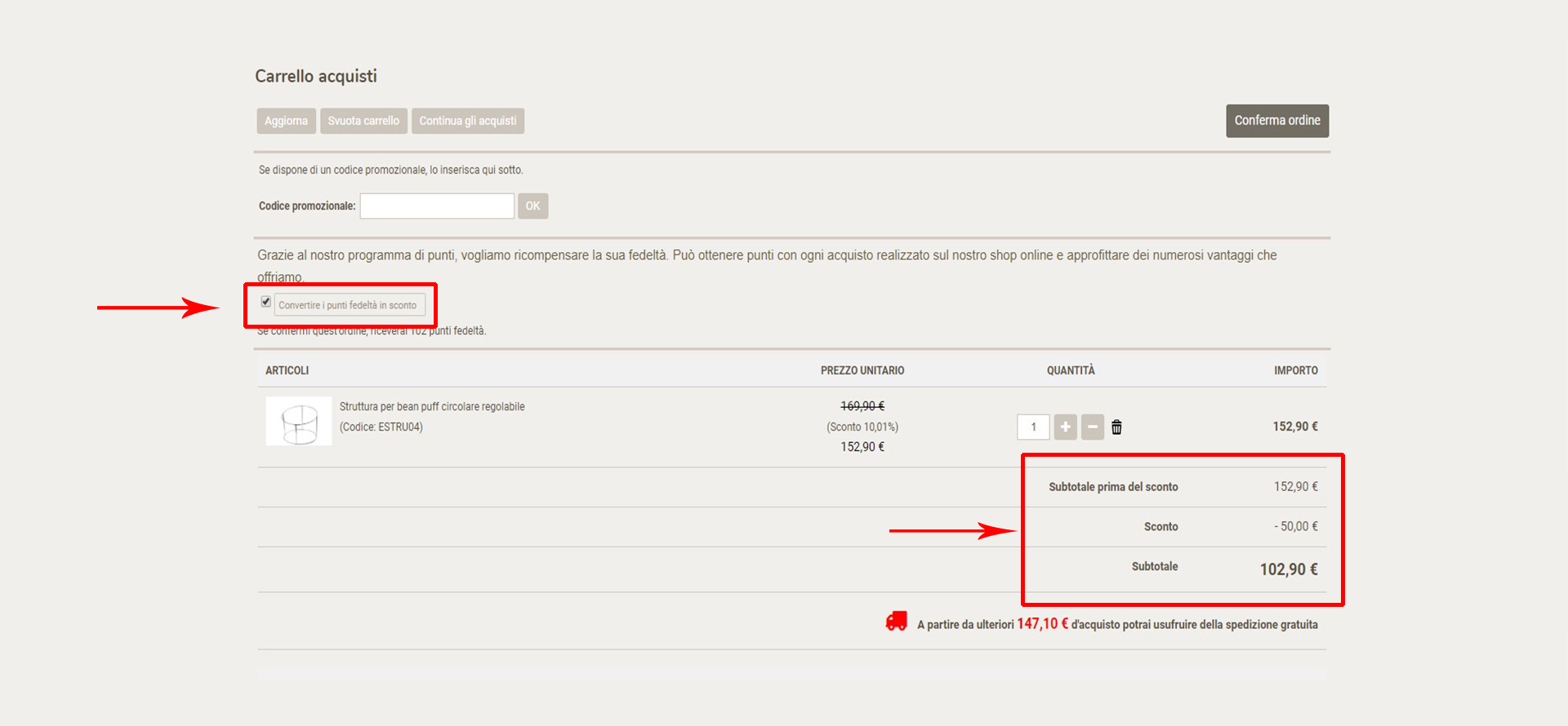 Ora può realizzare il suo acquisto. Dopo aver aggiunto i suoi articoli nel carrello, potrà visualizzare una casella nella parte superiore a destra. Selezionando la casella, il sistema applicherà direttamente i punti ottenendo uno sconto sul totale.
