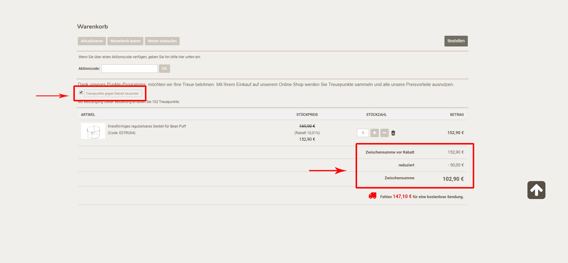 Sobald Sie alle Produkte im Warenkorb haben, können Sie mal eine Option ganz oben sehen: Klicken Sie hier an, falls Sie Ihre Punkte bei diesem Einkauf einlösen möchten.